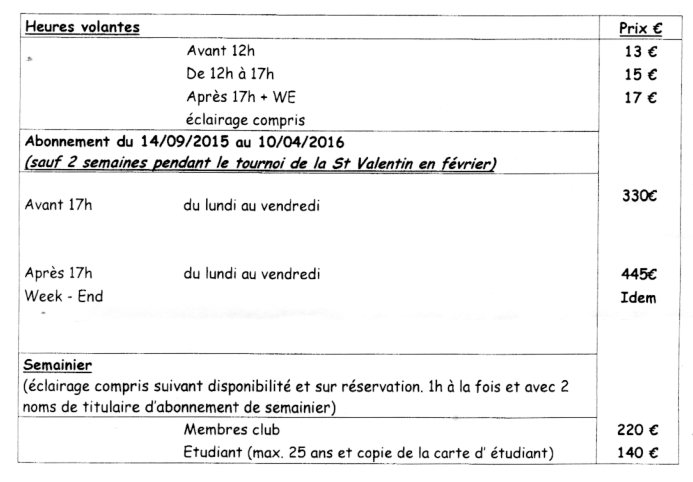 Le compte est calculé par demi-terrain et par heure. Le joueur "volant" paie chaque fois son demi-terrain. L'abonné paie son demi-terrain en dehors de l'heure